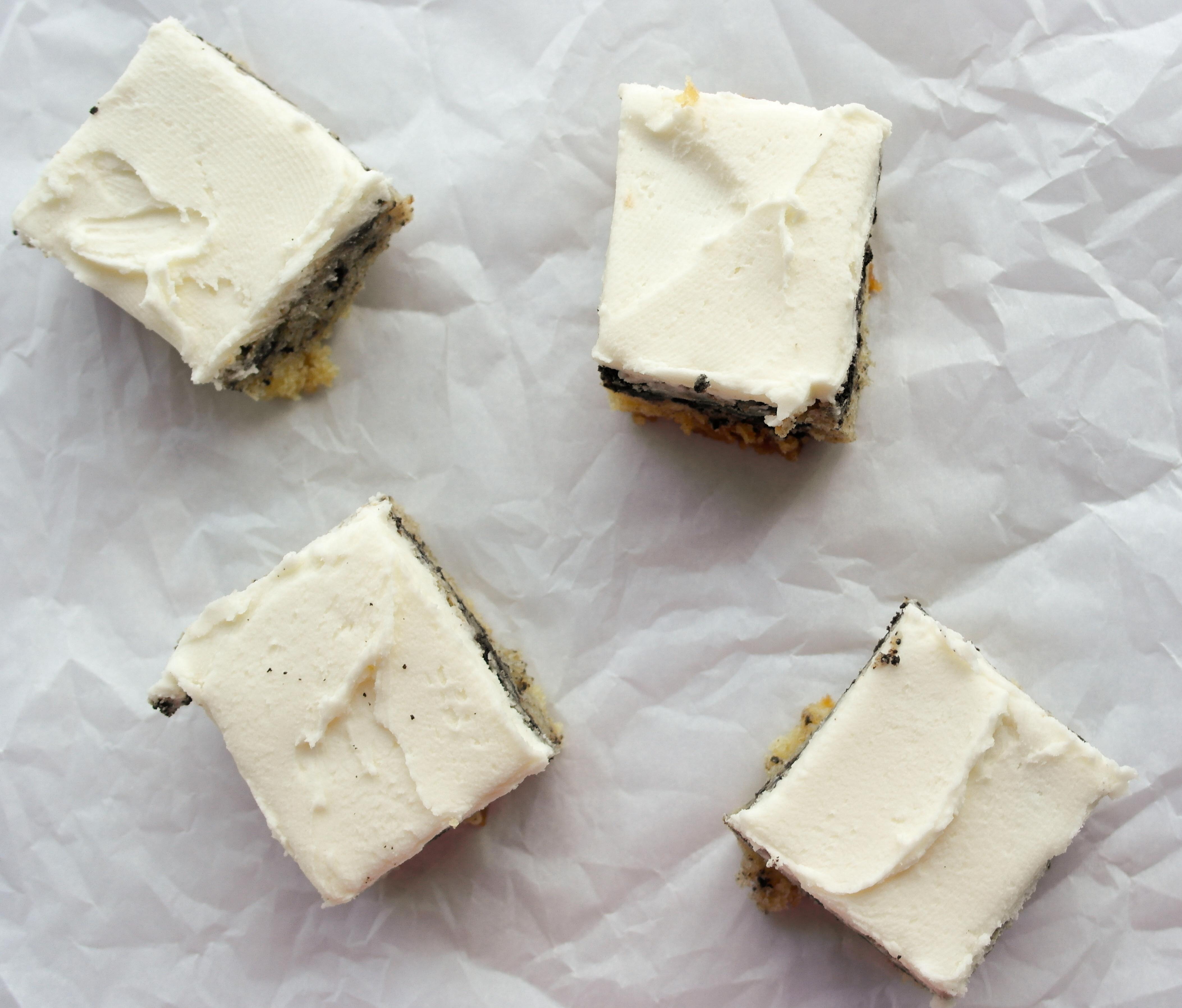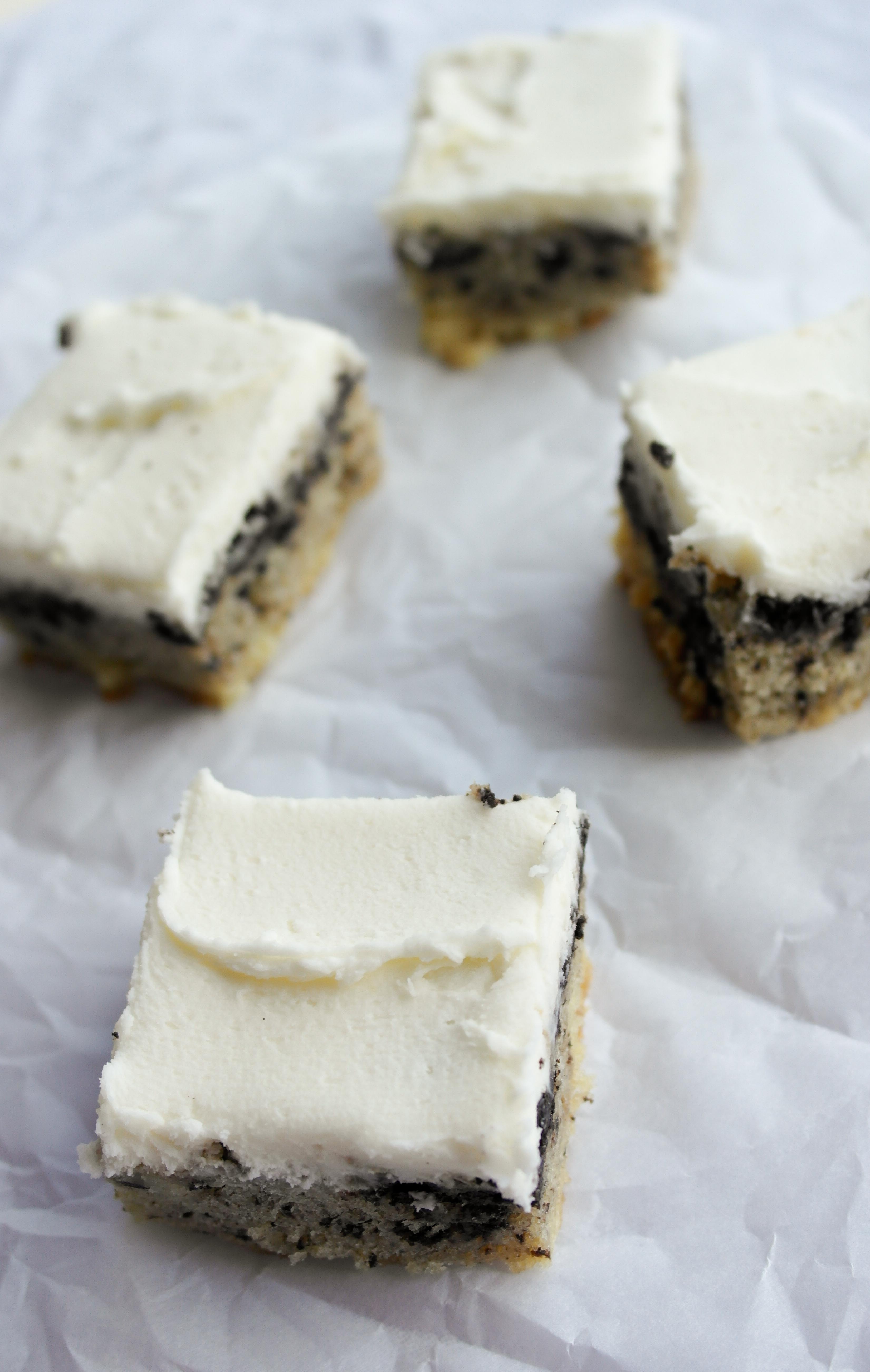 The trick to these bars is two fold. First, you have to crush the Oreos up very fine, or even better, use a blender or a food processor. Then, you make a giant batch of cake, split the batch in half and then fold in the Oreos into one half. Then bake, and watch the world fall at your feet for a taste of these bars. (Obviously this is an exaggeration, but you can never be too enthusiastic about Oreos.)