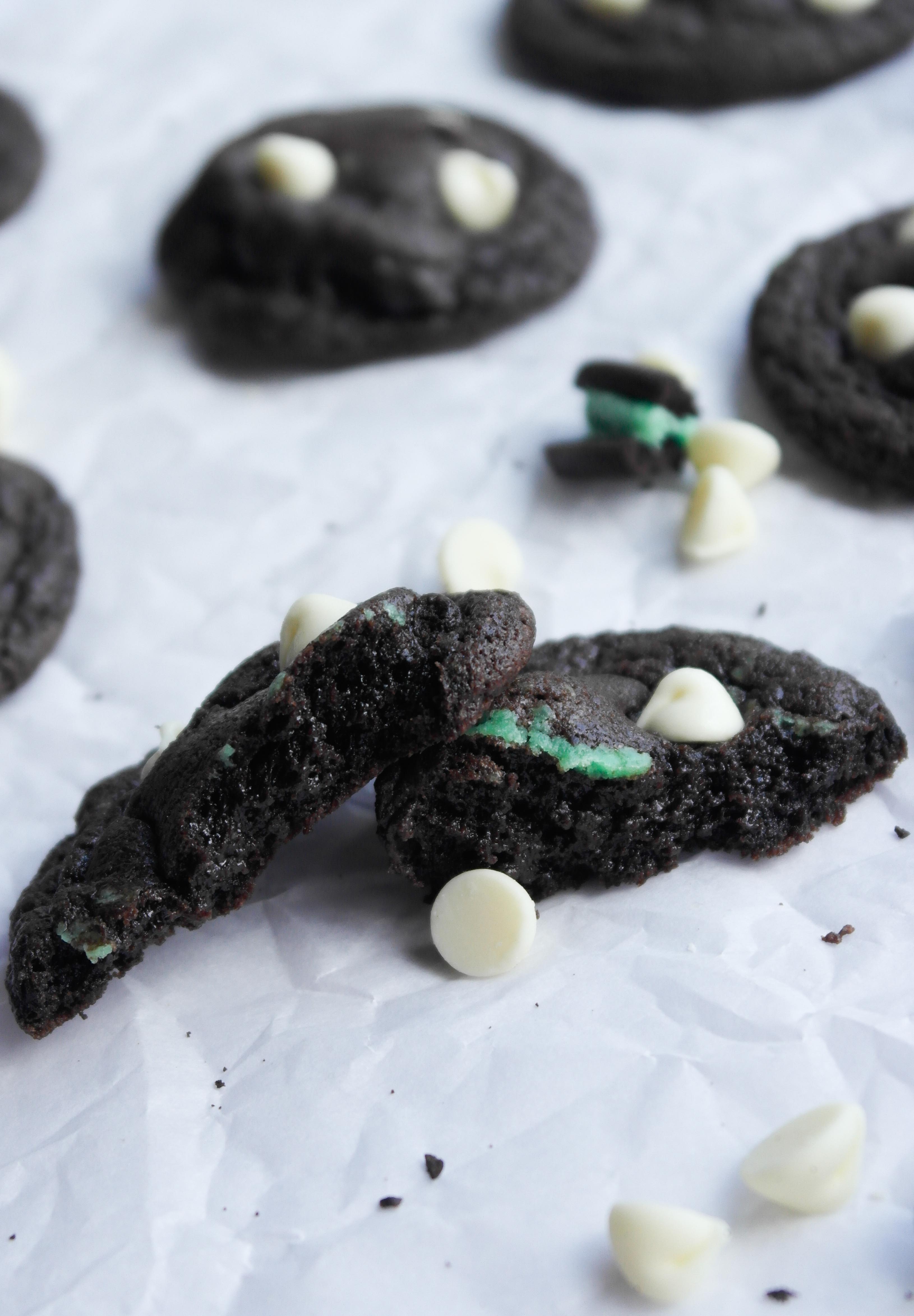 These cookies are so refreshing. They’re inspired by my favorite combo of double chocolate cookies and Oreo pieces in the batter. This time around, I used Mint Oreos, my new favorite thing in the whole entire world and I could eat them all day every day. Mmmm. You can find mint Oreos at most grocery stores. I highly recommend them, even though they’re not one hundred percent necessary for the recipe. You’ll see why in a second.