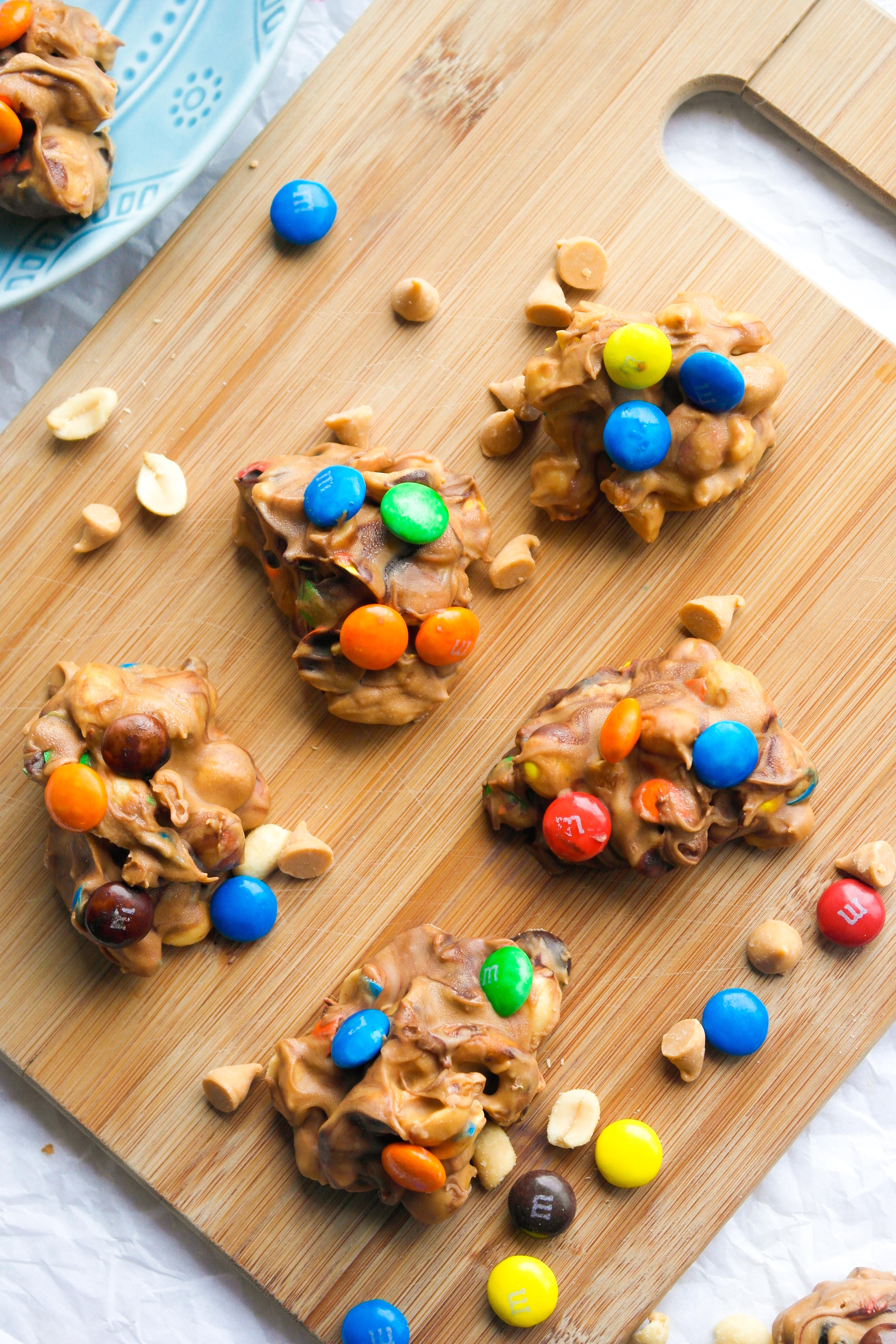 These no bake clusters are full of butterscotch and peanut butter (the world’s most irresistible combo) and are stuffed full of pretzels, M&Ms and peanuts!