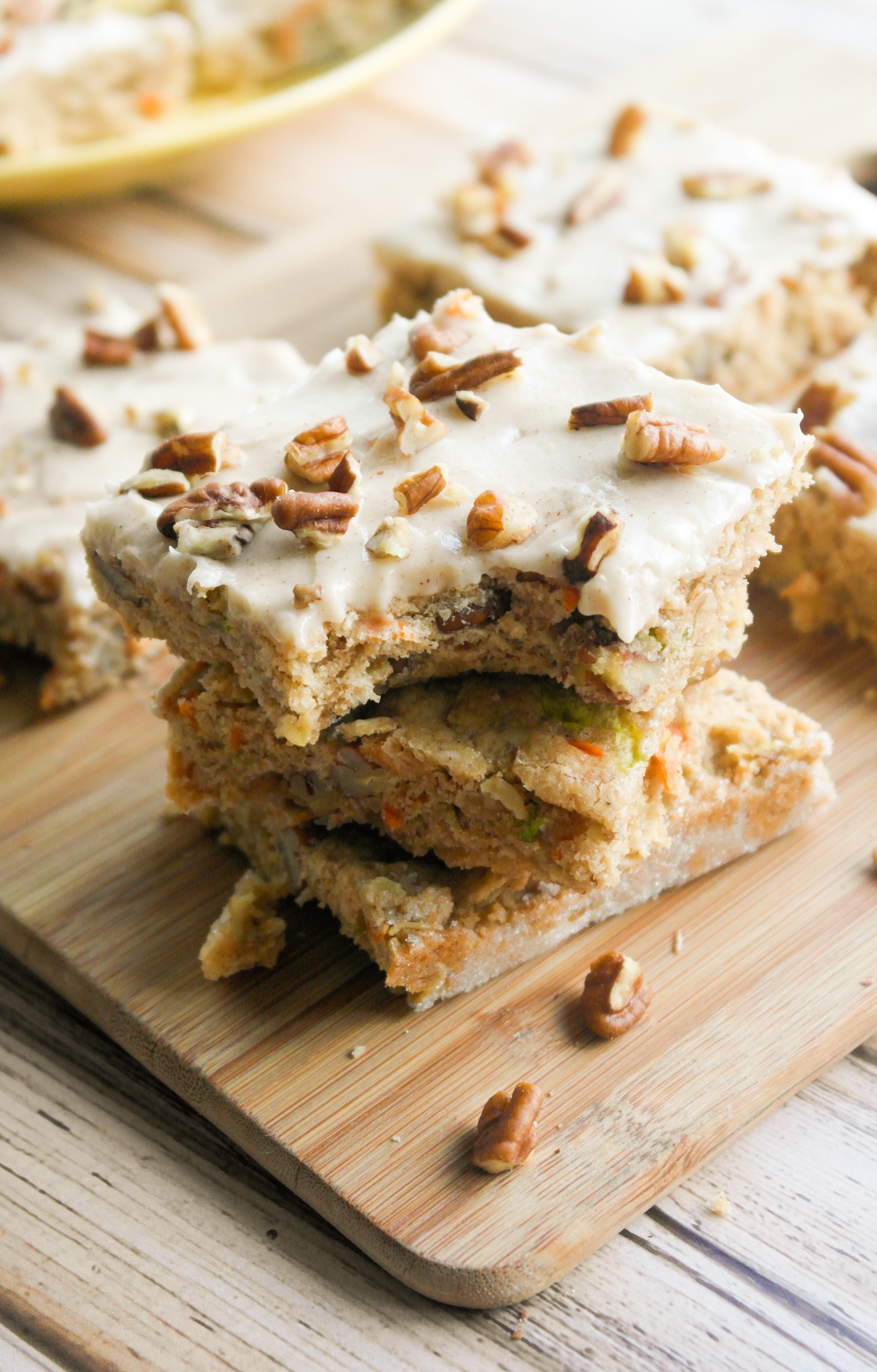 So how did this idea come around? Oh, the typical way. I had a zucchini and a carrot in my fridge and a hankering for thick, spiced bars (Just wait until pumpkin season rolls around…). I envisioned a cookie bar that was thicker and slightly cakier than a cookie. I wanted these bars to dance the line of cake and cookie.